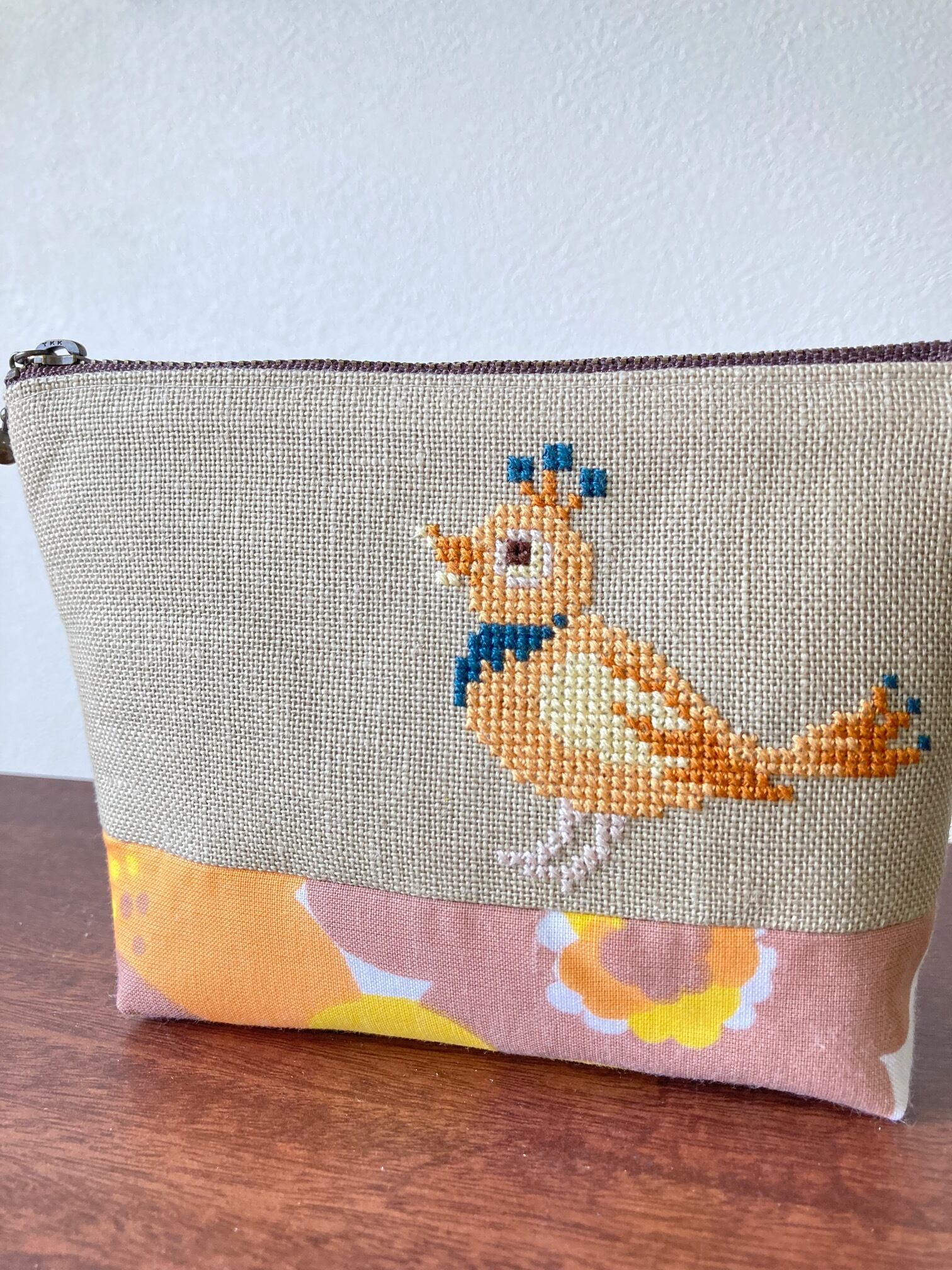 ※色使いを変えて鳥をステッチし、ポーチに仕立てました。