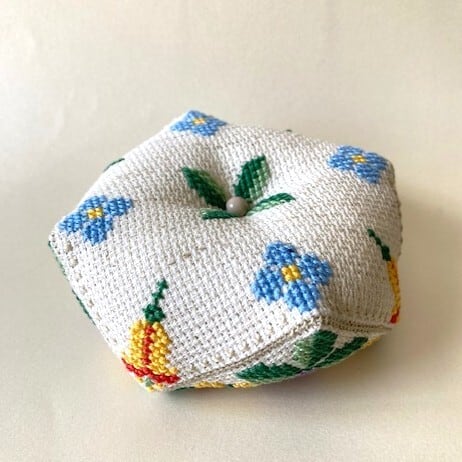 正方形の2枚の生地を半分ずらして閉じ合わせていくと出来上がる八角形のピンクッションです。